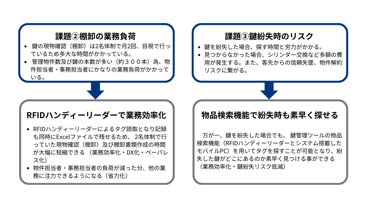 また、昨今企業に求められるDX化・業務効率化・省力化を進めながら、会社の鍵管理に則った管理を確実にする為、当社が抱えている鍵管理の問題を鑑み、業務改善・効率化ツールとして当該システムの導入を検討するに至りました。