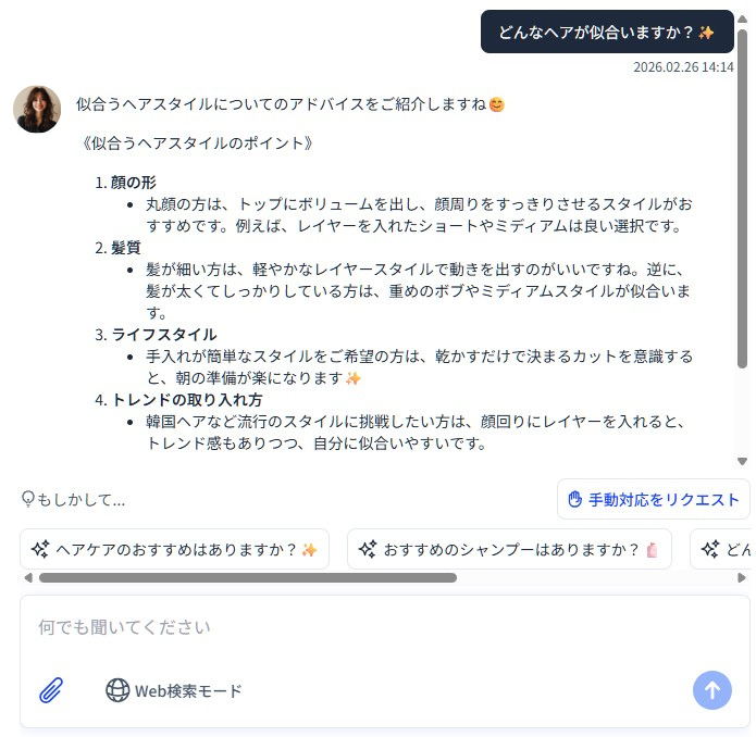「営業時間は何時まで?」「お店はどこ?」「カットが得意なスタイリストは?」「このメニューの料金は?」「予約はどうすればいい?」——来店前に顧客が抱きやすい疑問を、人の手を借りずにカバーします。