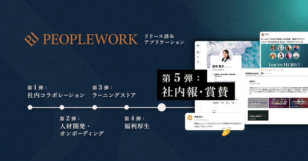 「PeopleWork」は、企業の持続的な成長のために、社員の能力発揮を支援するエンプロイーサクセスHRプラットフォームです。この中で複数のプロダクトをご提供しており、これまで、入社・異動・昇格した社員の即戦力化のためのプラットフォーム、社員の成長環境をつくるための人材開発・オンボーディングアプリケーション、ラーニングコンテンツを購入できるラーニングストア、福利厚生のためのアプリケーションをリリースしております。この度、第5弾プロダクトとして、社内報・賞賛アプリケーションの提供開始に至りました。今後も、エンプロイーサクセスに一層貢献できるよう、順次開発を進めてまいります。