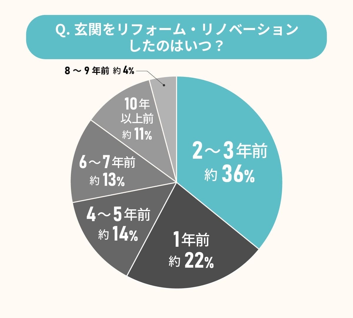 一番大きなボリュームゾーンが2〜3年前の約36%。また、直近5年間でリフォームをした人が約72%と大きな割合を占めていました。