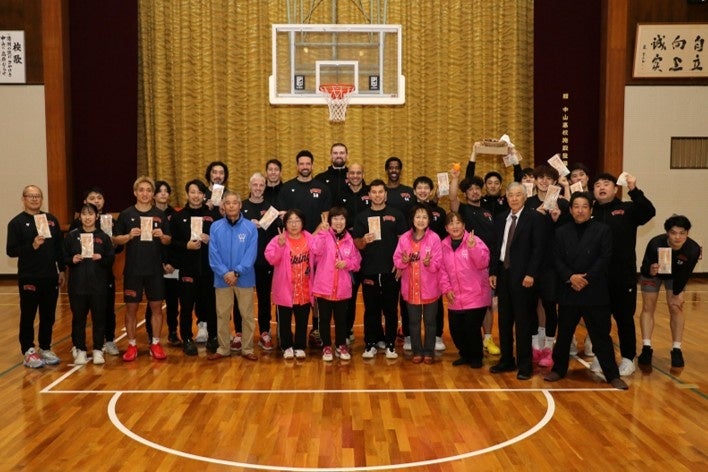 2025年12月23日に、伊予市中山地域を元気にしたいと活動する住民ボランティア団体「なかやま十彩会」(以下、「十彩会(といろかい)」という。)が、地域に練習拠点を置くプロバスケットボールチーム「愛媛オレンジバイキングス」(以下、「バイクス」という。)に対し、必勝を祈願する手作りの「勝栗御守」を贈呈しました。未来高校中山キャンパス体育館で行われた贈呈式では、地域住民とプロチームが一体となり、スポーツを通じた地域活性化の新たな一歩を踏み出しました。