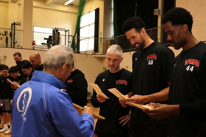 今回の贈呈式では、十彩会が心を込めて手作りした「勝栗御守」が、バイクスの選手・スタッフ一人一人に贈られました。