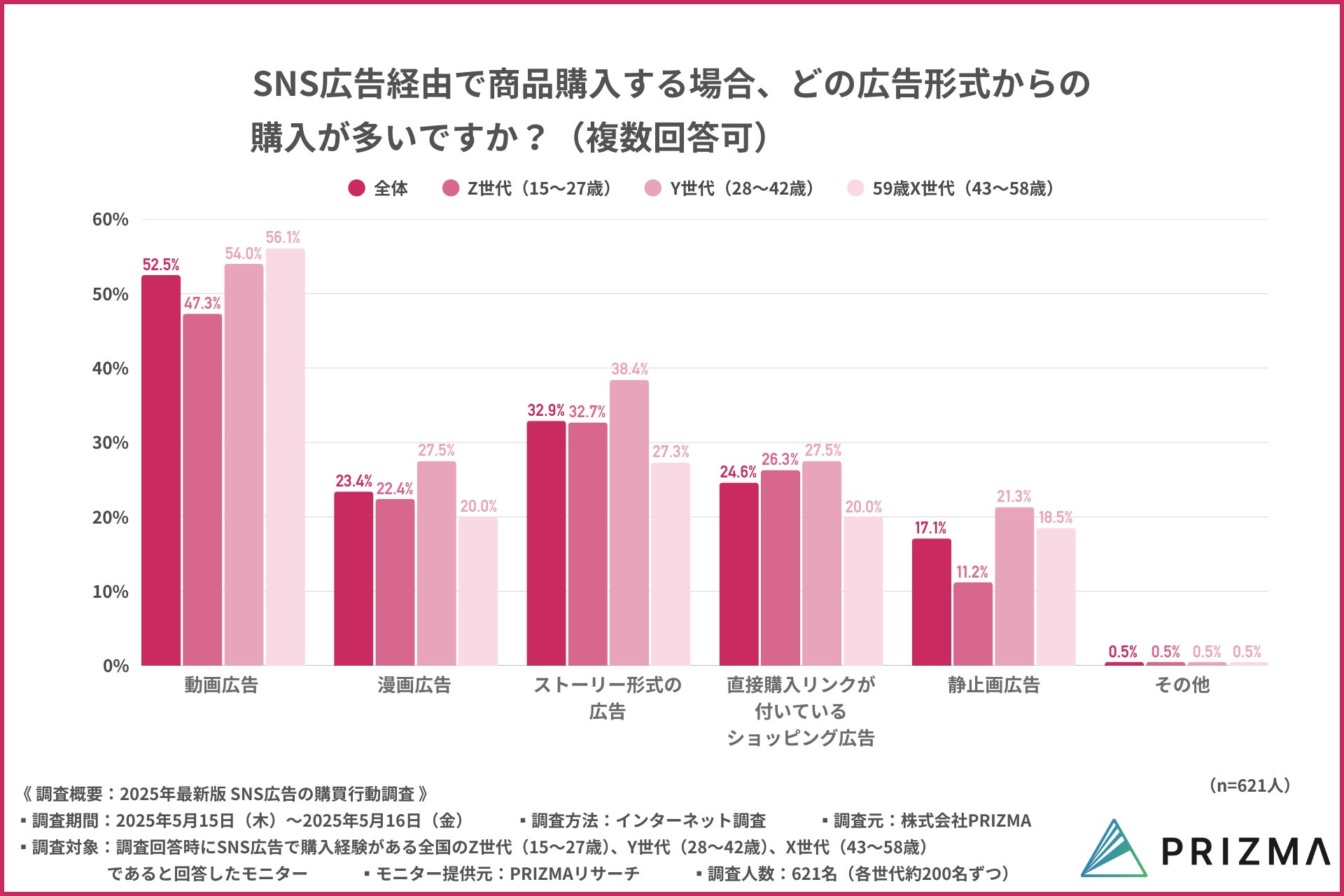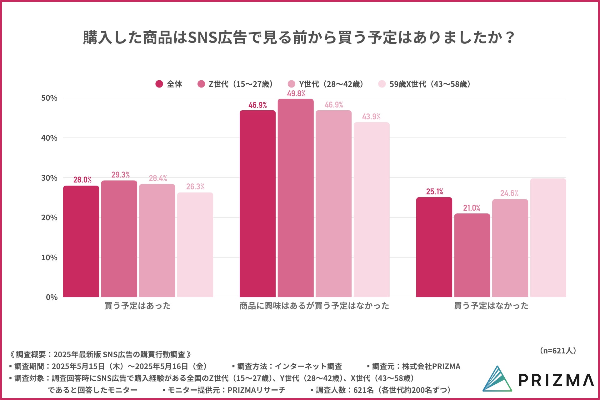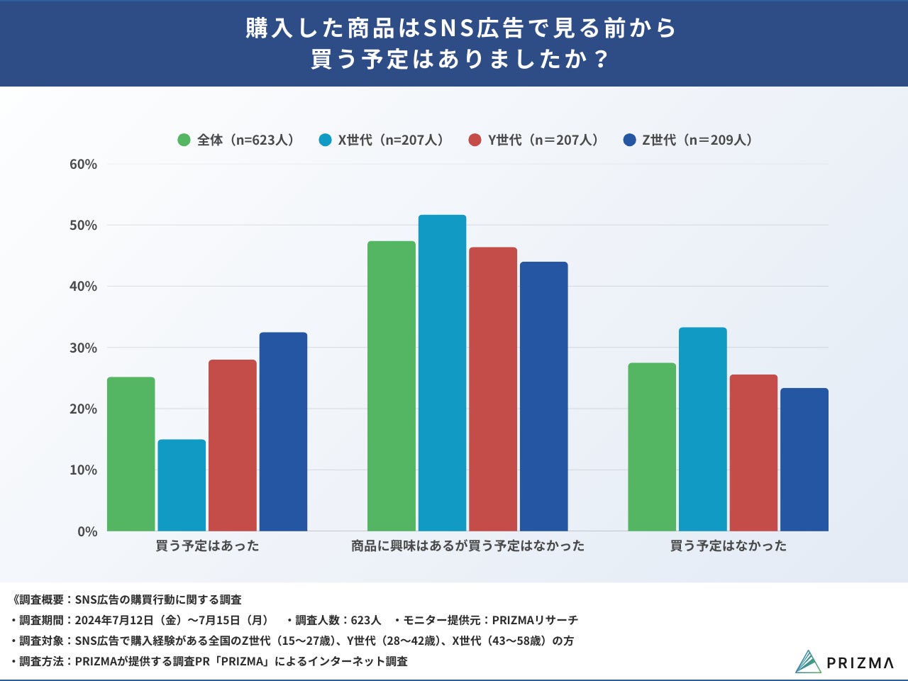 そこで今回、株式会社PRIZMA(https://www.prizma-link.com/press)は、SNS広告で購入経験がある全国のZ世代(15〜27歳)、Y世代(28〜42歳)、X世代(43〜58歳)の方623人を対象に、「2025年最新版 SNS広告の購買行動調査」を実施しました。