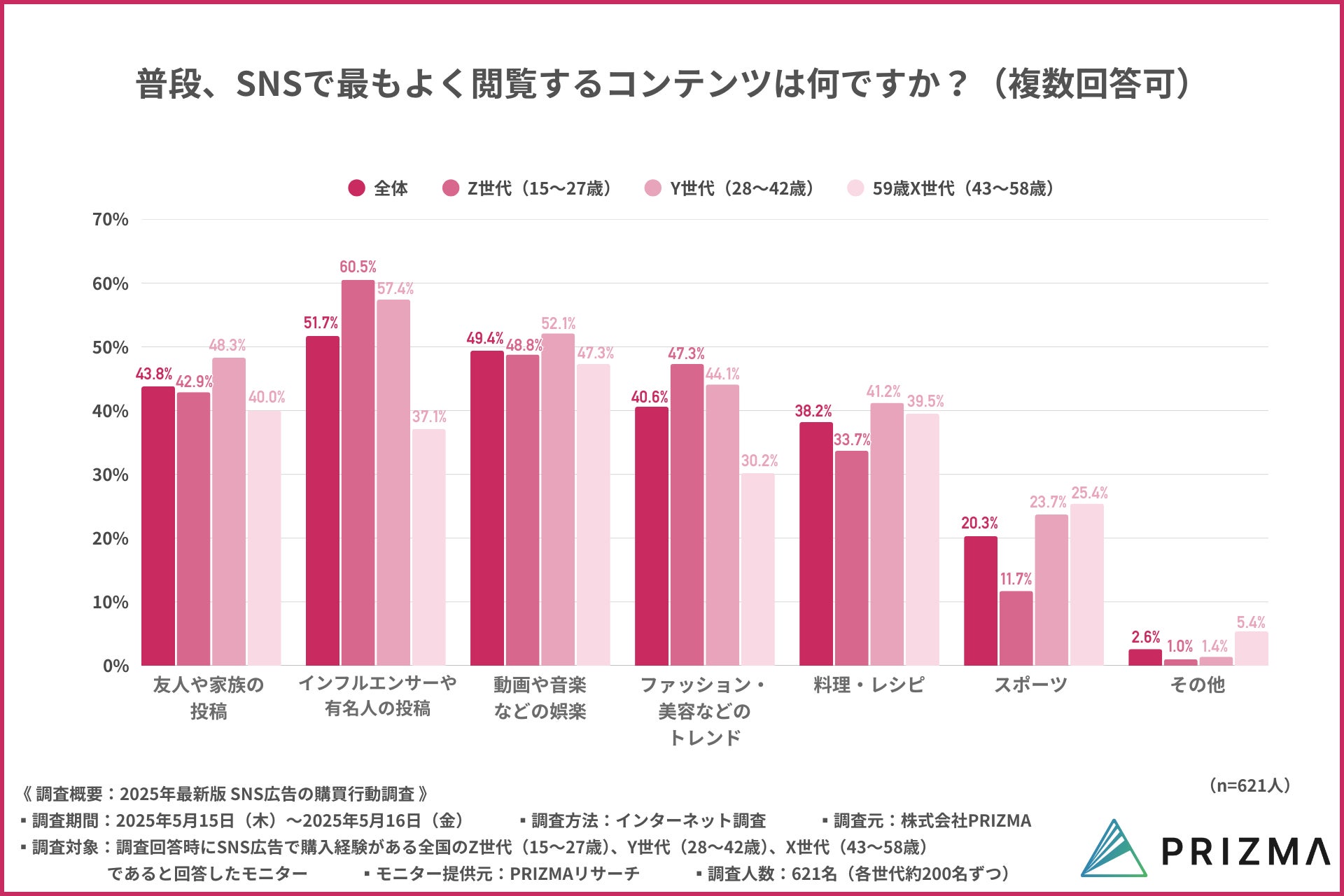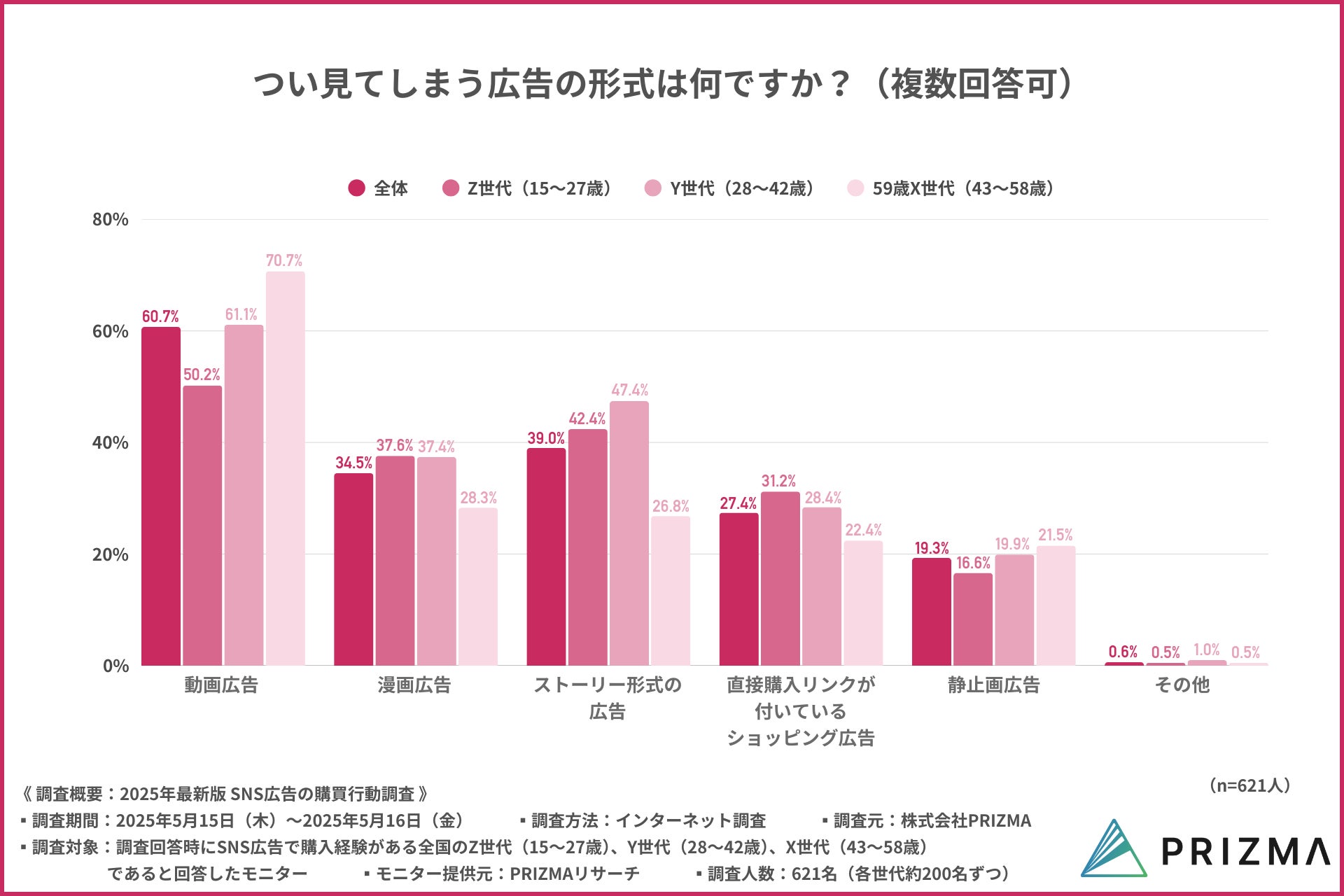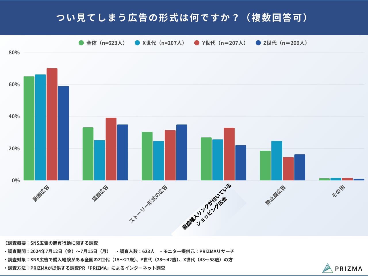そこで今回、株式会社PRIZMA(https://www.prizma-link.com/press)は、SNS広告で購入経験がある全国のZ世代(15〜27歳)、Y世代(28〜42歳)、X世代(43〜58歳)の方623人を対象に、「2025年最新版 SNS広告の購買行動調査」を実施しました。
