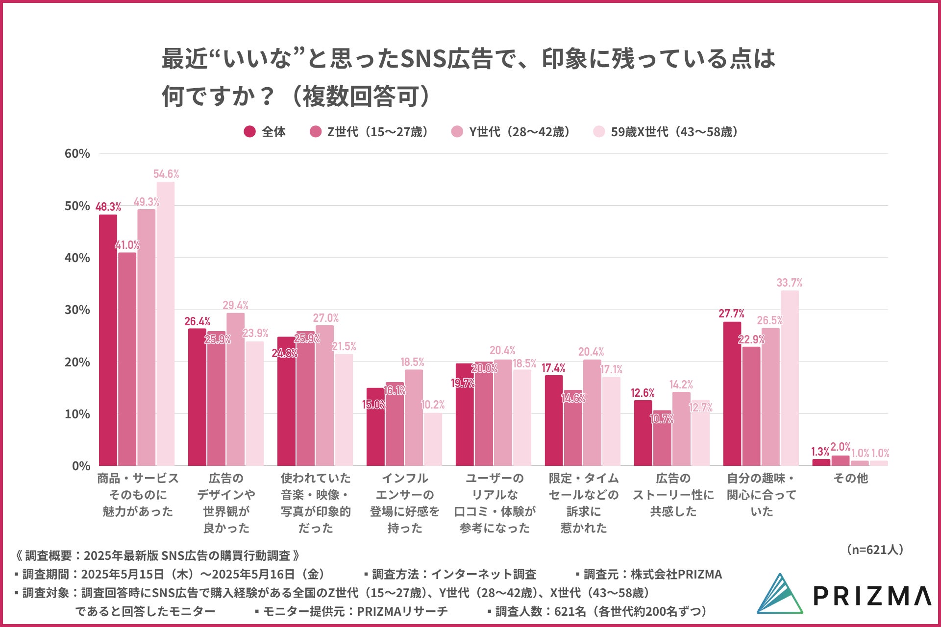 最後に、本年度の新たな設問として「最近“いいな”と思ったSNS広告で、印象に残っている点は何ですか?」と質問したところ、最も多かったのは『商品そのものの魅力(48.3%)』で、Z世代~X世代まで高い割合を記録しました。