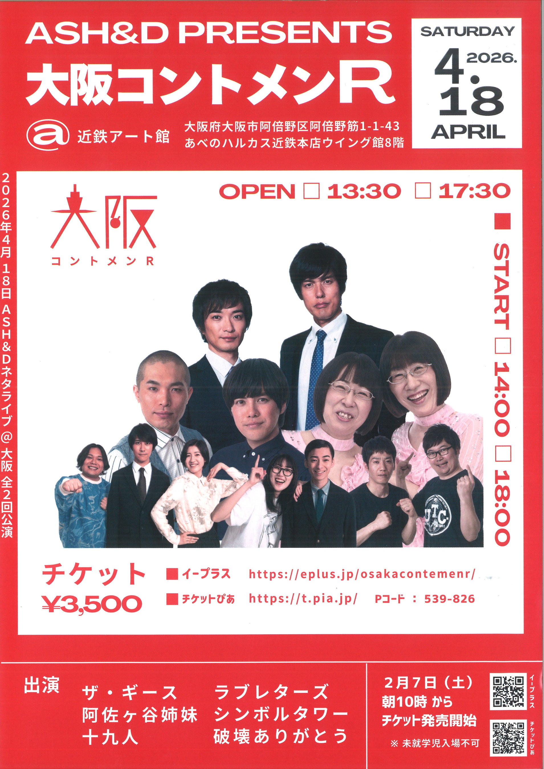 4月18日(土)はNHKの番組でも活躍中の阿佐ヶ谷姉妹、2024年キングオブコント王者のラブレターズが所属する「ASH&Dコーポレーション」の事務所ライブ『大阪コントメンR』の開催となります。