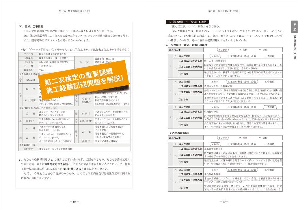 後半の第2編では、第二次検定の過去問題とその対策について指南しています。とくに、第二次検定合格に向けて最重要ポイントともいえる施工経験記述問題については、どのようなことに注意し記述すればよいか、よい記述例を具体的に示しながら詳細に解説しています。