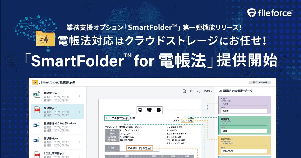 電子帳簿保存法対応はクラウドストレージにお任せ!AIによる自動化も組み込んだ日常業務をテクノロジーで支える「SmartFolder for 電帳法」提供開始