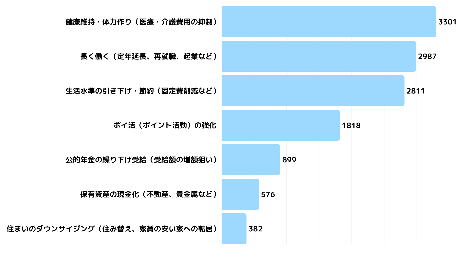 【対策のリアル】 資産運用以外で意識している対策トップは「健康維持(3,301件)」。次いで「長く働く」「節約」に続き、「ポイ活(1,818件)」が生活防衛術としてランクイン。