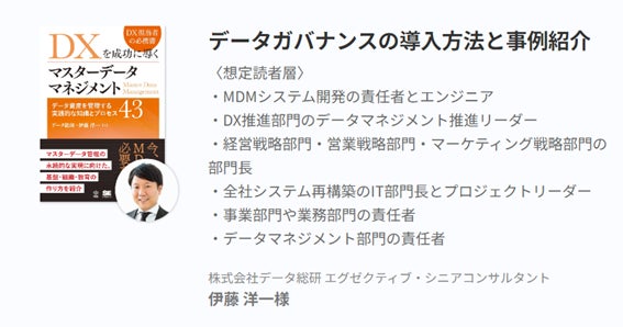 また、セミナーにご参加いただいた方には、伊藤様が執筆した書籍「DXを成功に導くマスターデータマネジメント」を配布いたします。