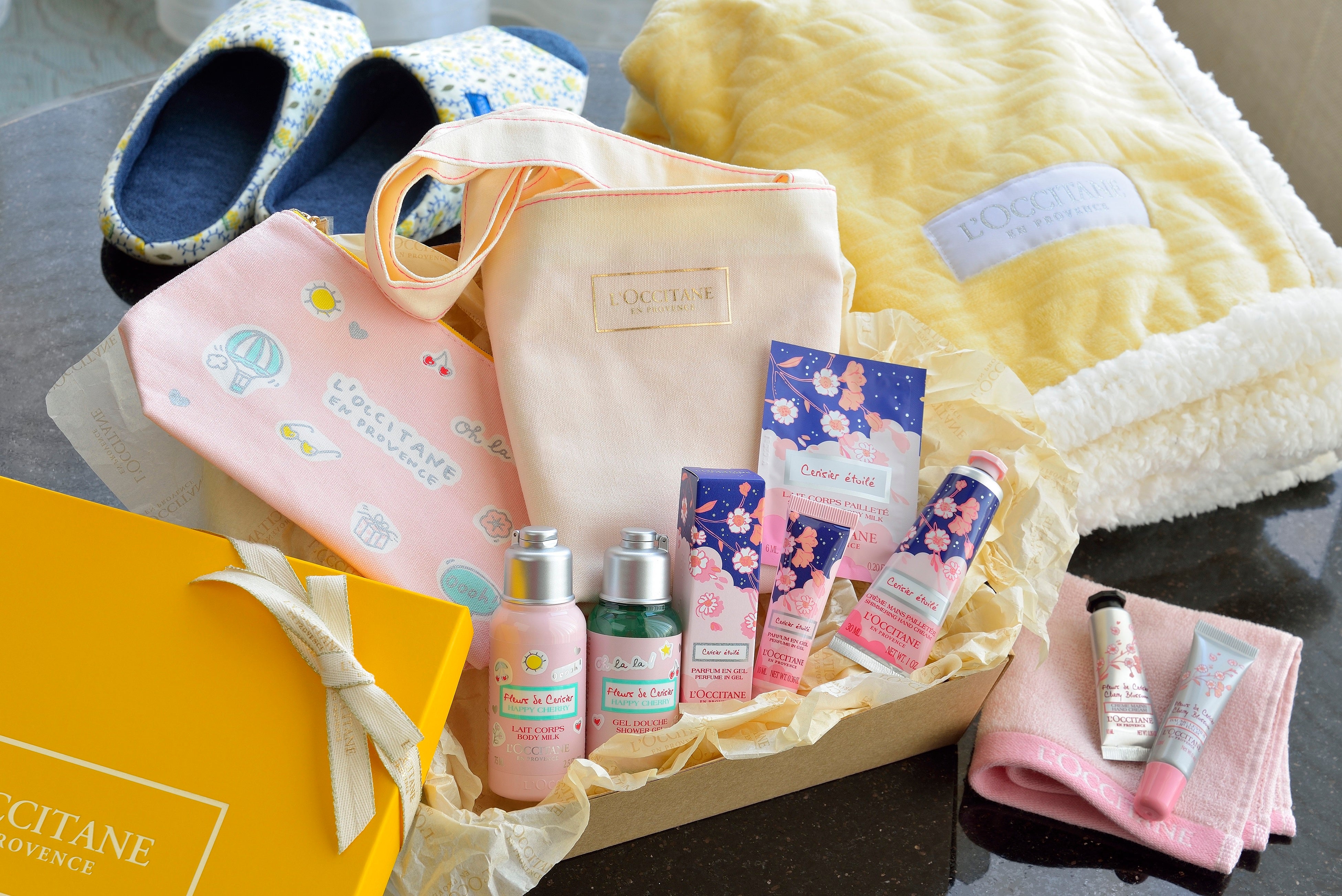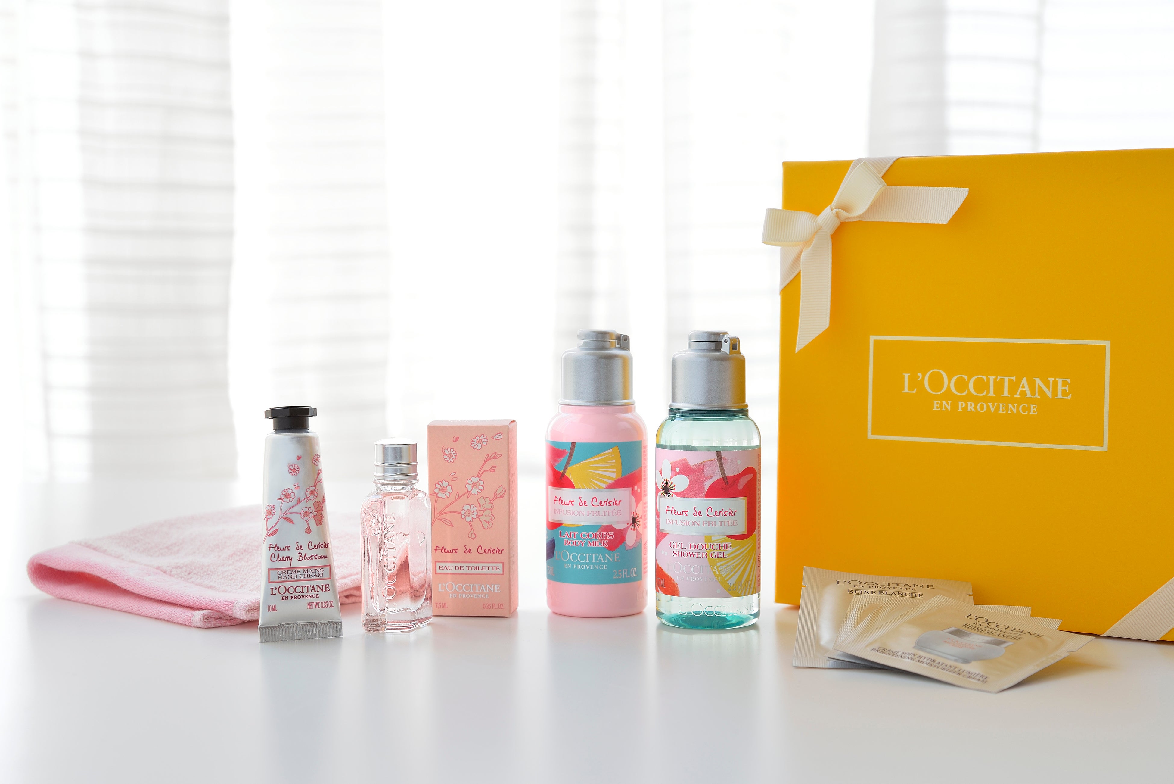 「L'OCCITANE桜ステイ」プランでは、ご帰宅後にもご自宅で桜気分を楽しめる、限定の「チェリーブロッサム」や「チェリーライム」アイテムを含むロクシタンのトラベルセットをご用意。