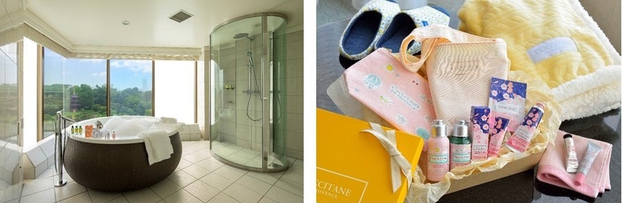 ロクシタンの「チェリーブロッサム」シリーズの世界観をイメージした、バスタブから庭園を望むビューバススイートにお泊りいただく本年のプランでは、チェリーブロッサムのバスアメニティのほか、新製品である「サクラサボン」シリーズのハンドクリームやジェリーフレグランスをはじめとする、桜香るギフトコレクションをご用意。また、普段ご予約が取りづらい時期の「ル・ジャルダン」のアフタヌーンティーもスパークリングワインとともにお部屋にお届けいたします。南仏リュベロンの繊細な桜の香りの「チェリーブロッサム」とともに、窓の外に広がる桜の景色を望むバスタイムを堪能ください。