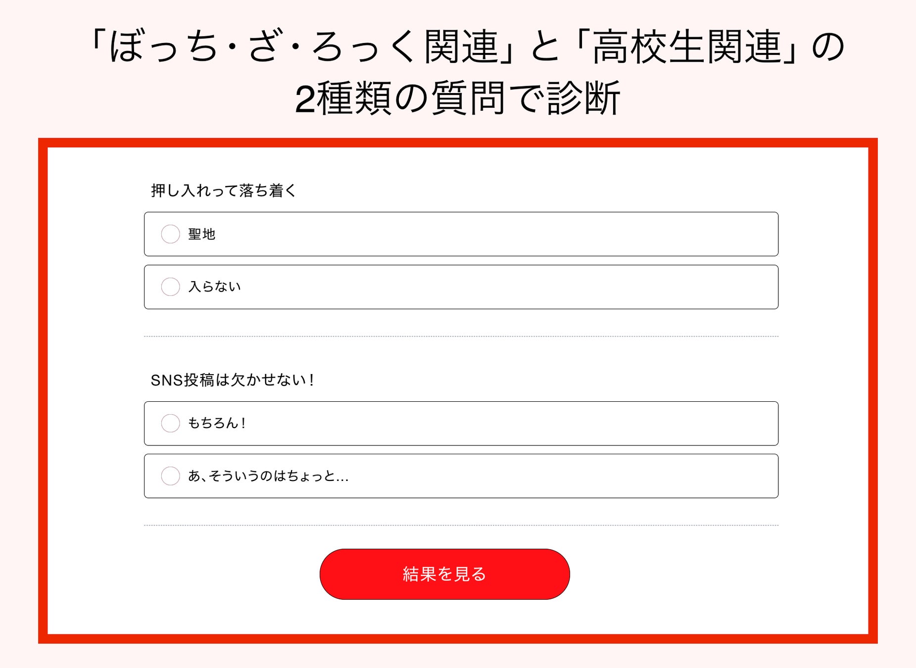 自分の性格タイプからアニメ「ぼっち・ざ・ろっく!」のキャラクターと相性の良いアルバイトを診断。この診断を通じて、参加者の「知りたい」「言いたい」という欲求を満たし、診断参加率の最大化とSNSでのUGCを促進。
