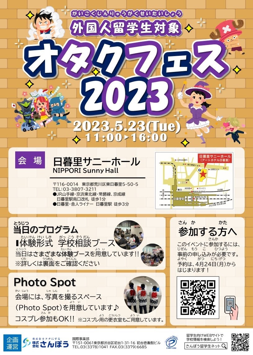 日本語教育機関に在籍する外国人留学生を対象に進路情報の提供を行う株式会社さんぽう(本社:東京都渋谷区/代表取締役社長:渡邉王雄)は、5月23日(火)に日暮里サニーホール(アートホテル日暮里4階)にて「オタクフェス2023」を開催します。対象は国内の日本語教育機関に在籍する外国人留学生です。学校の説明を「聞く」、資料を「見る」だけでは、留学生に伝わりにくい専門学校の学びの特徴や面白さを凝縮した体験学習を通して、直接「触って」「作って」「感じて」もらう体験形式進学相談会で、参加費無料、入退場自由です。