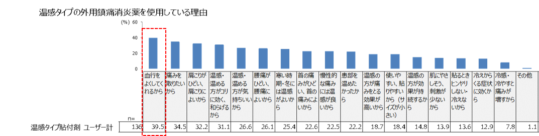 20~60代の男女を対象に当社が実施した調査(*1)によると、1年以内に外用鎮痛消炎薬を購入した人のうち約5人に1人が温感タイプを購入していることが分かりました。温感タイプを購入している人は、「効果の高さ」を期待している一方で、「血行をよくしてくれる」なども期待して使用する傾向にあることが分かりました。