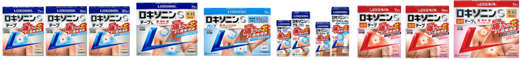 左から、「ロキソニンSテープ」7・14・21枚入、「同 テープL」7枚入、「同 パップ」7枚入、「同 ゲル」25・50g、「同 ローションa」25・50g、「同 温感テープ」7・14枚入、「同 温感テープL」7枚入(いずれも第2類医薬品)