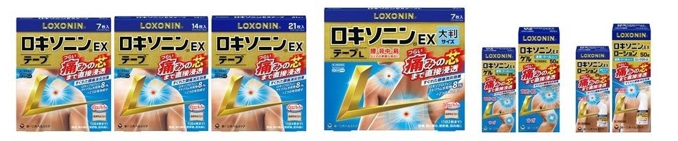 左から、「ロキソニンEXテープ」7・14・21枚入、「同 テープL」7枚入、「同 ゲル」25・50g、「同 ローション」25・50g(いずれも第2類医薬品)