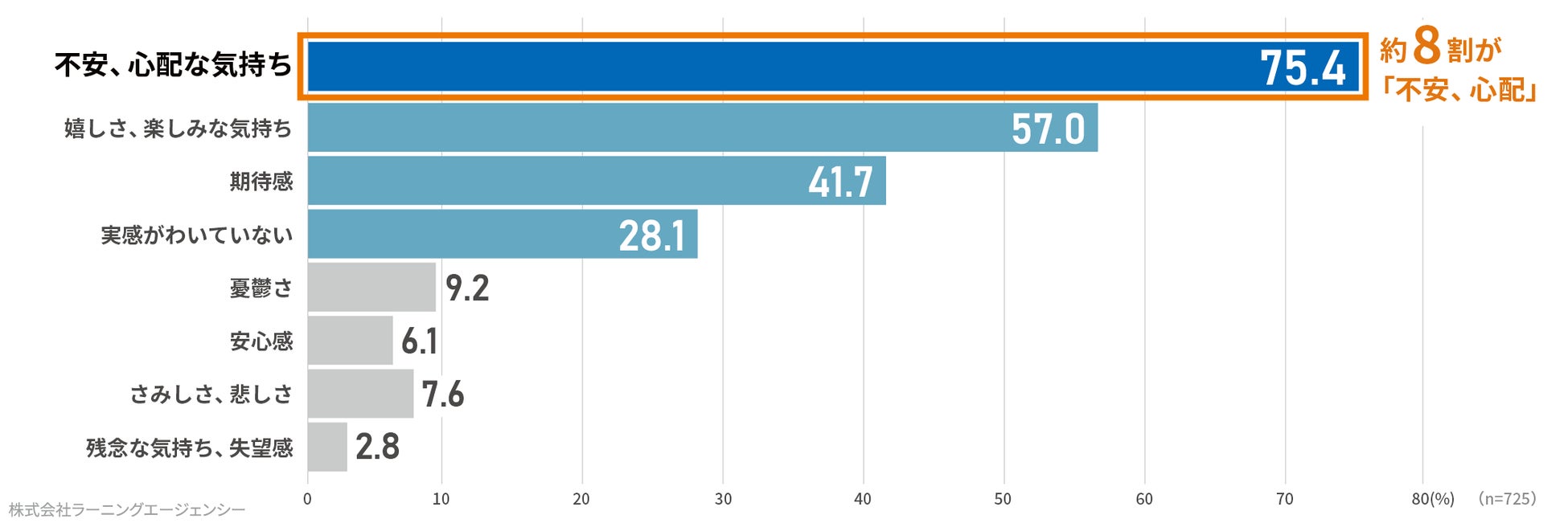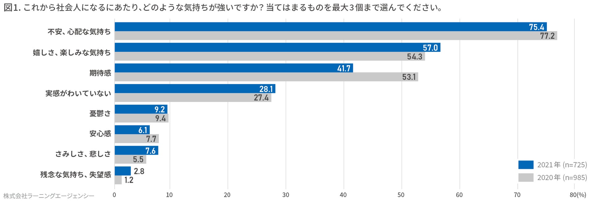 これから社会人になるにあたって、内定者はどのような気持ちが強いかを複数回答(最大3個)で尋ねたところ、トップは昨年同様「不安、心配な気持ち(75.4%)」でした。2位「嬉しさ、楽しみな気持ち(57.0%)」、3位「期待感(41.7%)」も昨年の調査結果と同じようにトップ3を占めたものの、依然として不安な気持ちと33.7ポイントの差が残っています(図1)。