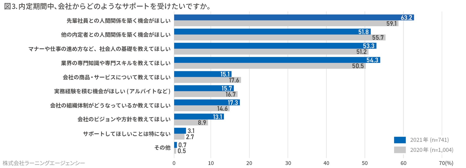 内定期間中に会社に希望するサポートでは、「先輩社員との人間関係を築く機会がほしい(63.2%)」が昨年同様トップになるとともに4.1ポイント増加しました。一方で、2位以降は昨年の結果から変化し、「他の内定者との人間関係を築く機会がほしい(51.8%)」が3.9ポイント減少。逆に「マナーや仕事の進め方など、社会人の基礎を教えてほしい(53.3%)」「業界の専門知識や専門スキルを教えてほしい(54.3%)」が、それぞれ2ポイント以上増加して2位と3位を占めています。内定者が抱える主な不安の内容に対応する結果になっているとともに、より多くの内定者が仕事面でのスキルアップを望んでいるようです(図3)。