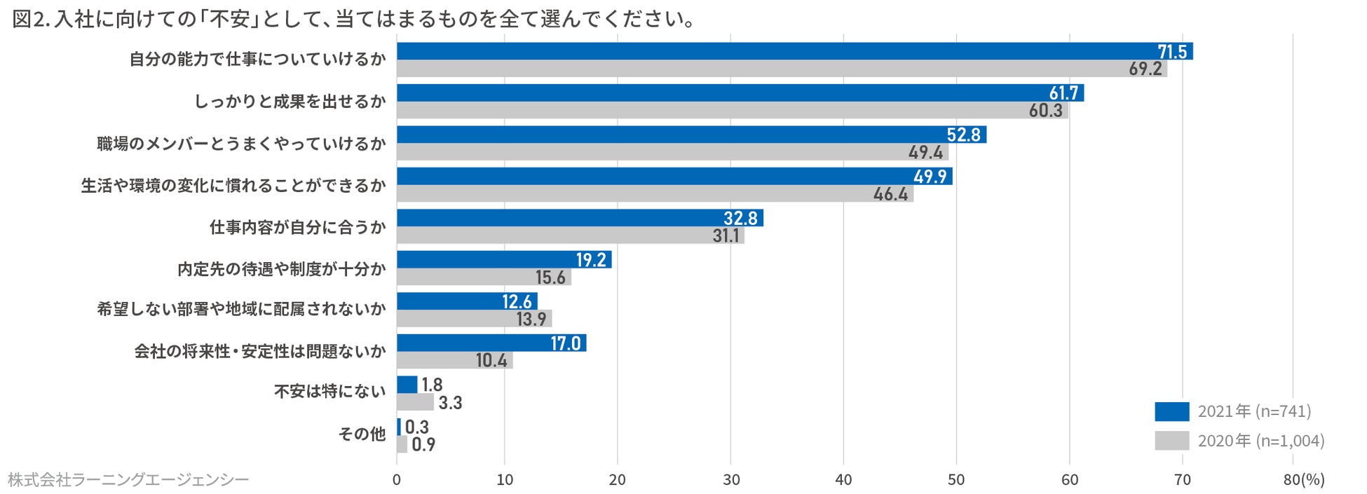 では、具体的にどのようなことが不安なのでしょうか。入社に向けて不安に感じていることを複数回答で尋ねた結果、多くの内定者が「自分の能力で仕事についていけるか(71.5%)」「しっかりと成果を出せるか(61.7%)」を選びました。特に1位の自分の能力に対する不安は2.3ポイント増加。3位の「職場のメンバーとうまくやっていけるか(52.8%)」も昨年から3.4ポイント増加しており、仕事での能力と人間関係の両方で不安があることがわかりました(図2)。