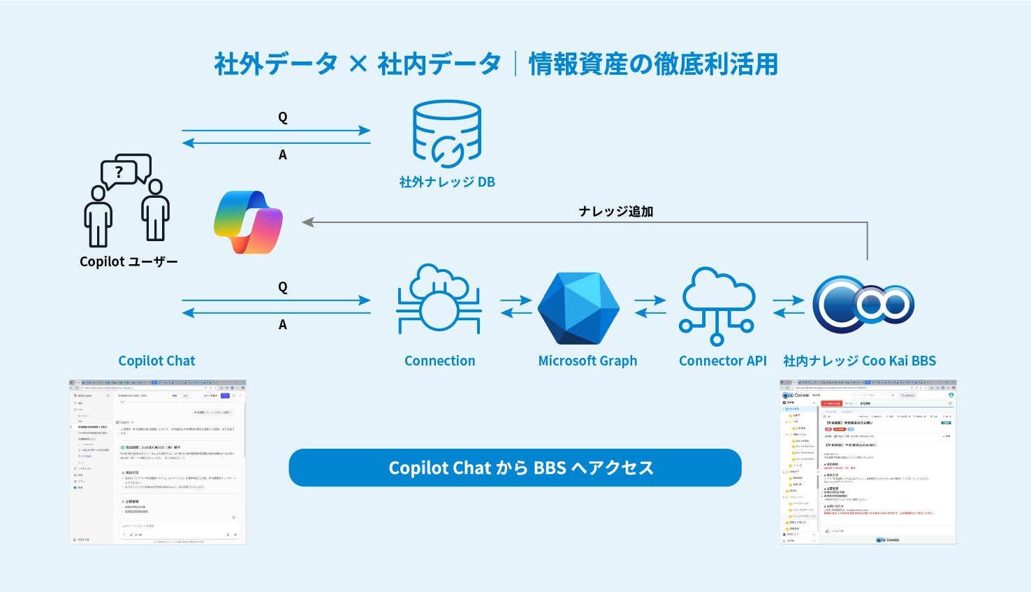 情報の最大公約数を導き出すAI(Copilot)。読み込むデータの量や種類が多ければ多いほど、その精度は上がります。今回のCoo Kai BBSのCopilot連携により、Copilot Chatから個社特有の情報源である社内掲示板(Coo Kai BBS)の情報を得ることが可能。日頃使い慣れたTeamsやCopilotからツールを切り替えることなく簡単に掲示板へもアクセス出来るようになりました。