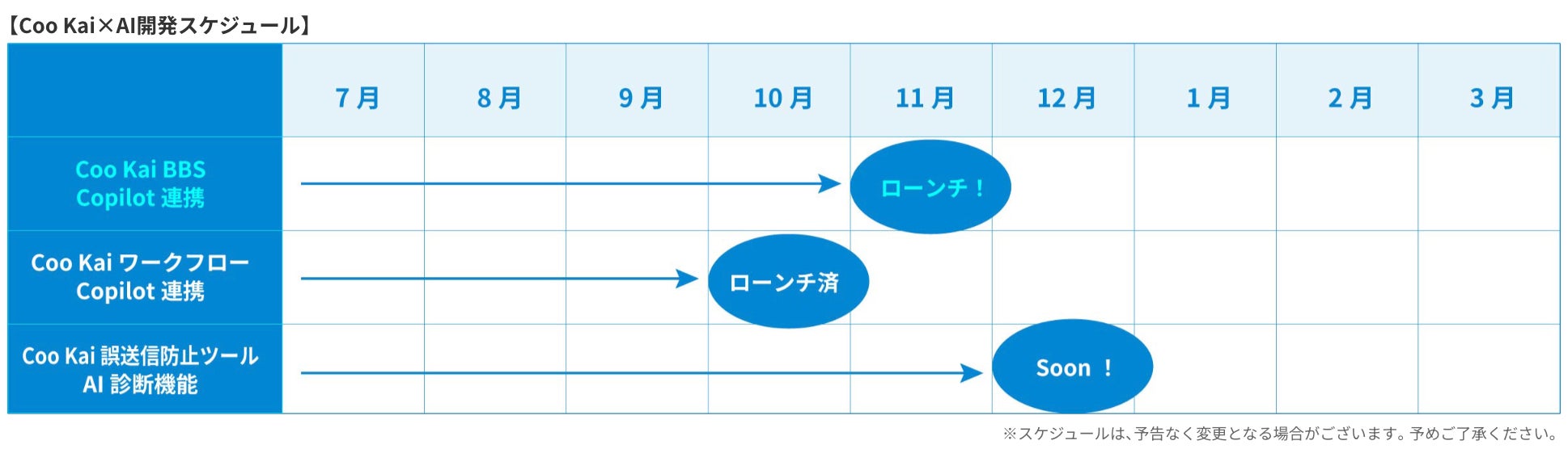 第一弾として「Coo KaiワークフローAI機能搭載」。Copilotと連携することで申請行為の一連をTeamsチャット上で自動化を実現。第二弾として今回のCoo Kai BBS Copilot連携をローンチ。さらにCoo Kai誤送信防止ツールのAI機能搭載をローンチを間近に控え準備中です。