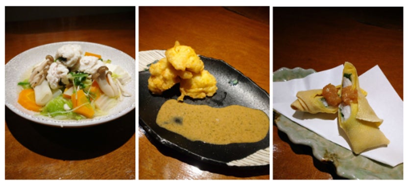 - 試食内容:左から「はもなべ」「はものフリット 岩のりクリームソース」「はもの湯葉巻き揚げ」