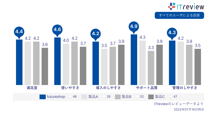 国内最大級 IT製品/ SaaSのレビューサイト「ITreview」で、「ITreviewカテゴリーレポート『ECサイト構築部門』(2022 Summer)」において、顧客満足度No.1を獲得しました。