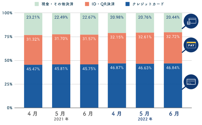 前回の調査と同様、クレジットカード利用の割合はほぼ変わらず。ID・QR決済利用が増加し、現金利用が減少しています。