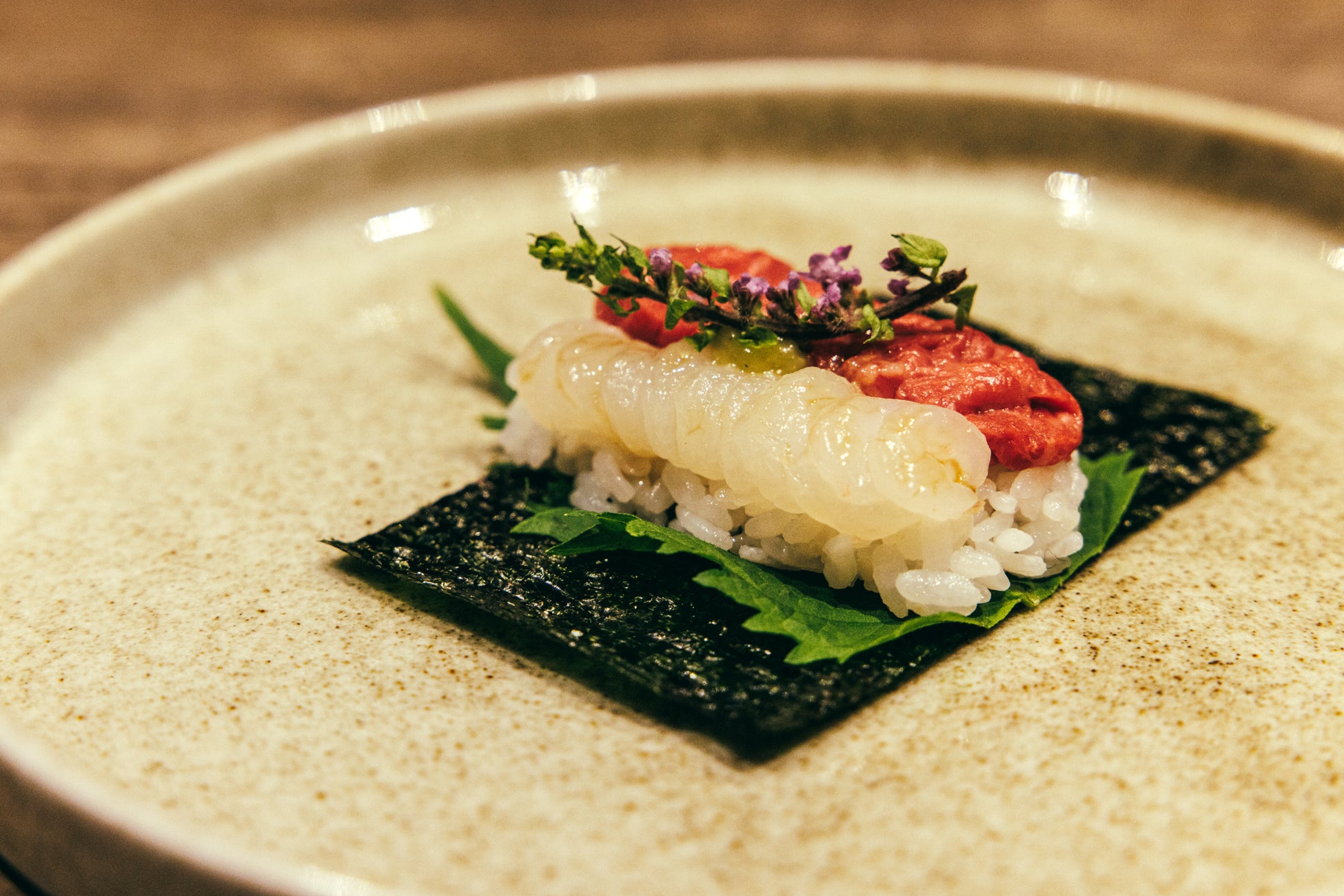 富山湾の宝石「白海老」と厳選した和牛赤身をシャリで引き締め、甘みと旨みを引き出しました。 磯の香り豊かな極上海苔“佐賀のはしり”で包んでお召し上がりください。