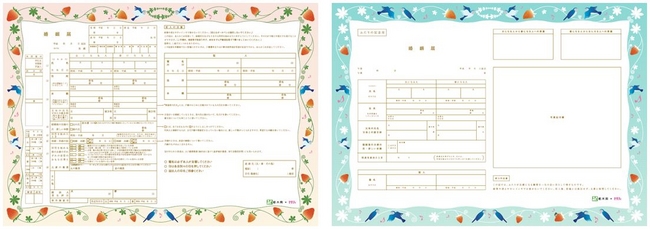 「いちご」で有名な栃木県は、可愛さにアンティークな雰囲気を漂わせたデザインの婚姻届に!よくみると、美しいさえずりで有名な栃木の鳥、オオルリが歌を歌っています。