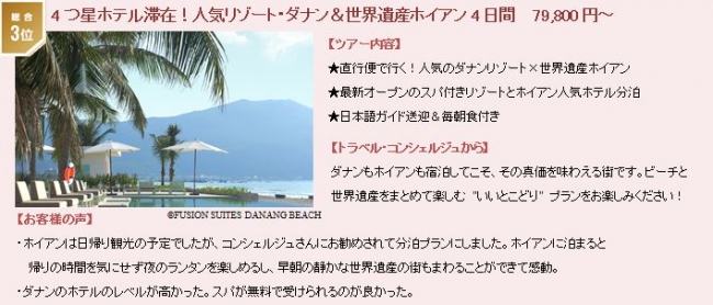 1位にランクインしたフィンランドは、近年のオーロラ人気や北欧雑貨ブーム、ムーミンの作者トーベ・ヤンソン生誕100周年(2014年)などから注目度UP。ヨーロッパでありながら最短9時間半で到着し、東京からは毎日直行便が運航、また大阪・名古屋からも就航がありアクセスの良さも人気のポイントです。またベトナムでは、ダナンが3位、ニャチャンが7位にランクイン。どちらも近年多くの高級ホテルがオープンする、新開発のリゾートです。旅工房の2015年の送客数は、ベトナムビーチ全体で前年比8倍※4と人気急上昇でした。