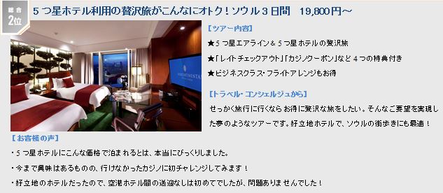 5つ星・4つ星・デラックスホテル利用などの贅沢旅をお手頃価格で楽しめるプランが人気を集めました。2位のソウルツアーは5つ星ホテル「インターコンチネンタル ソウル COEX」に宿泊する旅で、旅行代金はなんと19,800円~。お客様からも「5つ星ホテルにこんな価格で泊まれるとはびっくり」という声をいただきました。