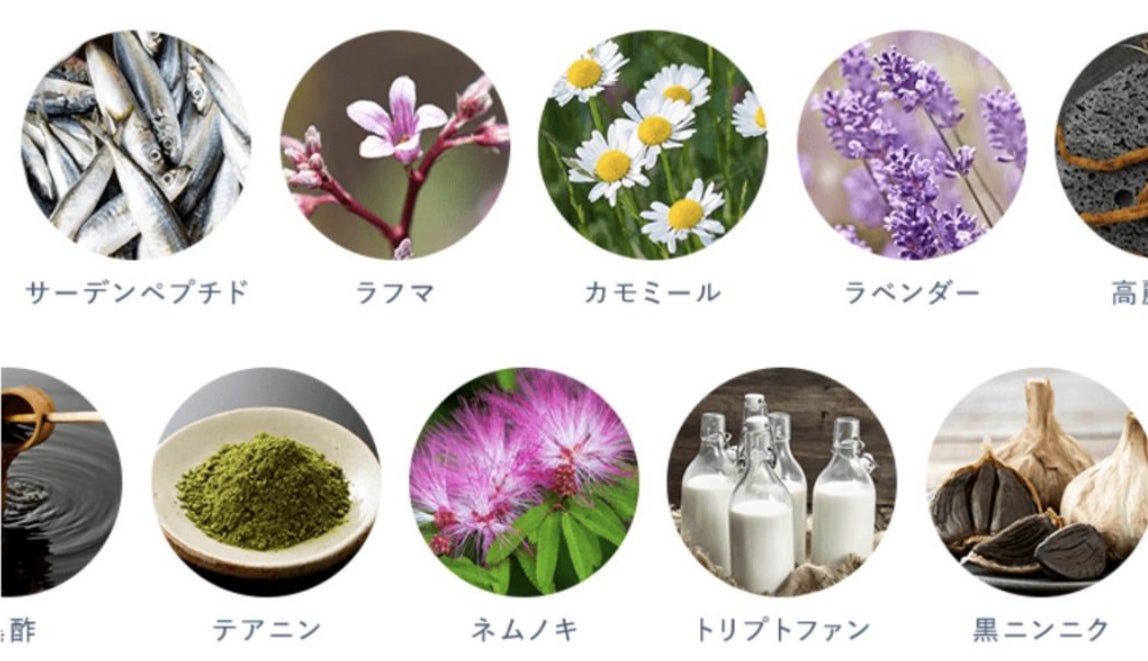 還元麦芽糖(国内製造)、γ-アミノ酪酸、カミツレ抽出物、サーデンペプチド、セラミド含有米抽出物、ネムノキ樹皮抽出物、ヒアルロン酸、ラフマ葉抽出物、ラベンダー末、鶏足抽出物(鶏肉・ゼラチンを含む)、高麗人参末、黒ゴマ抽出物、黒酢末、殺菌乳酸菌末、青トウガラシ発酵抽出物、発酵黒ニンニク末、有胞子性乳酸菌末/セルロース、ステアリン酸カルシウム、二酸化ケイ素、ビタミンB1、ビ