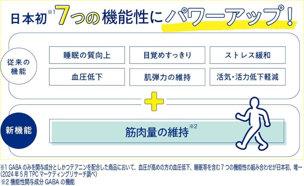臨床試験にて新たに「加齢に伴い低下する筋肉量を維持(※2)」する機能を実証しました。 これまでの6つの機能性は変わりなく、「筋肉量の維持(※2)」が追加されて全7つの機能性にパワーアップしました!