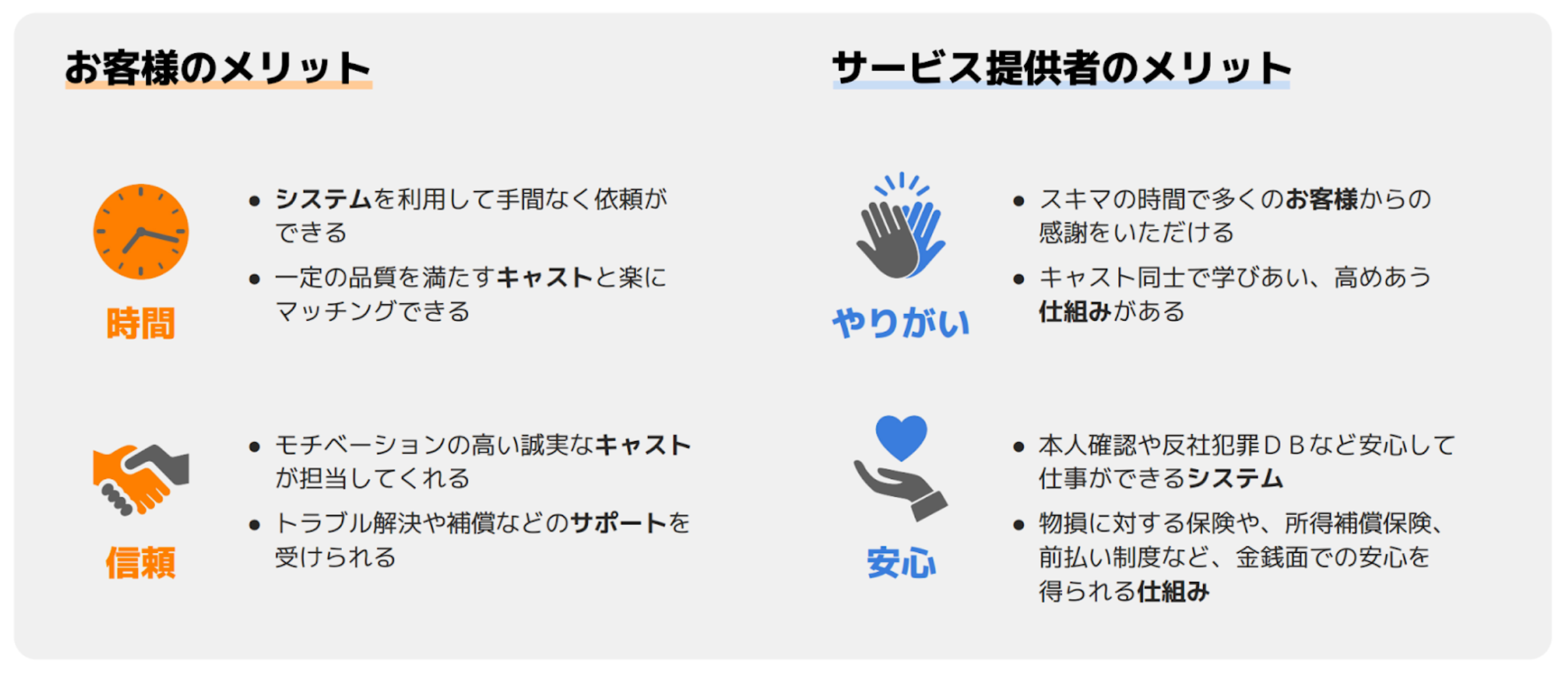 また、Technologyを活用したバリューチェーンの適正化によって、お客様にとっては「安価」、サービス提供者にとっては「高報酬」を実現しております。