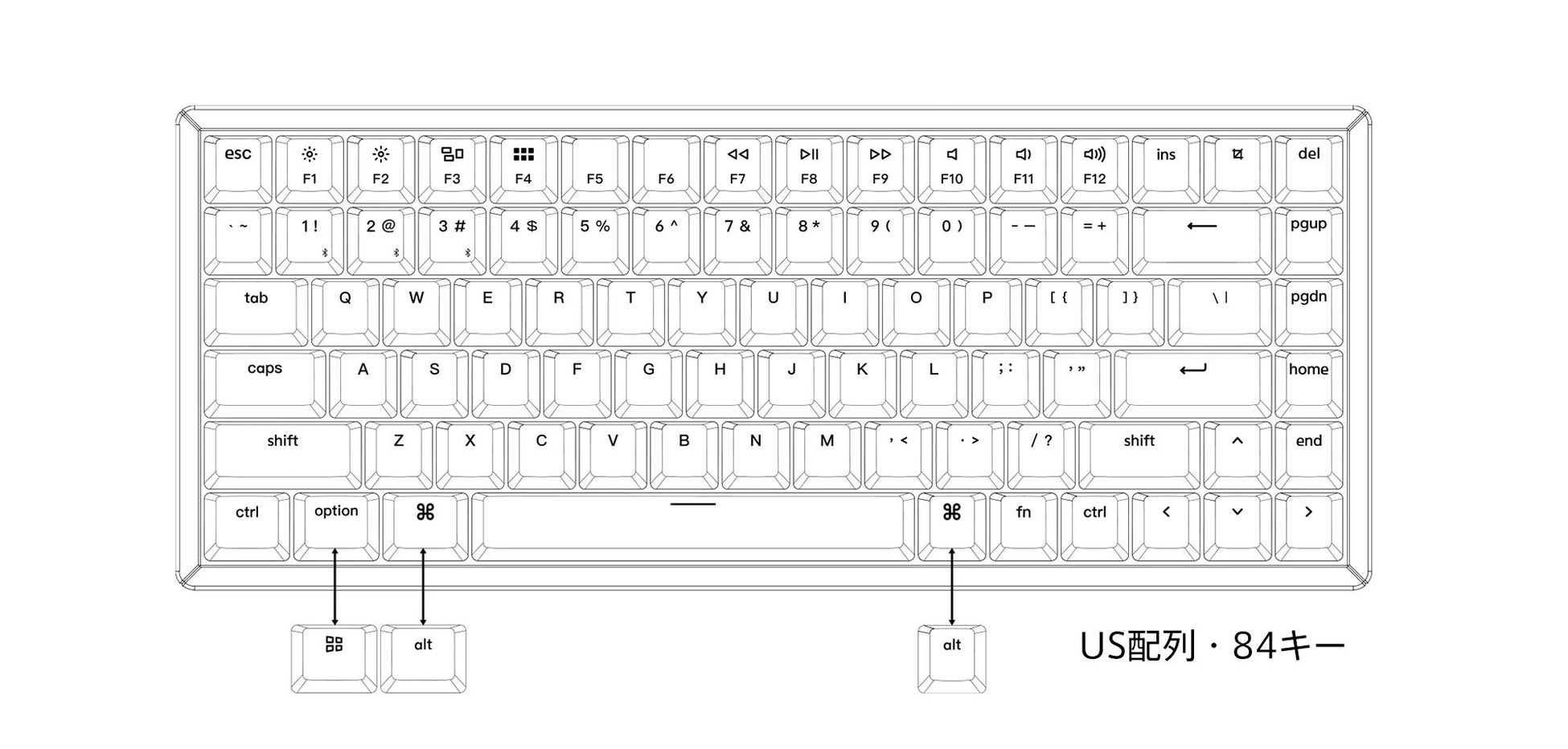 K2は、ページのアップ / ダウン、Home、End、スクリーンショット(cmd+shift+4)など、生産性向上のために重要なファンクションキーをすべて残した84キー(US)設計です。また、Nキー・ロールオーバー(NKRO:有線モードのみ)により、一度に押せるキーの数だけ、文字を取りこぼすことなく登録することができます。