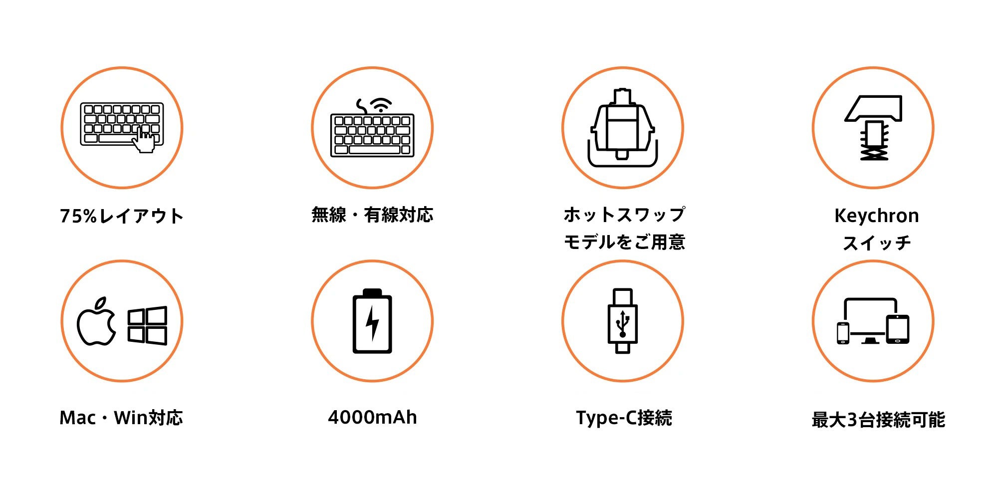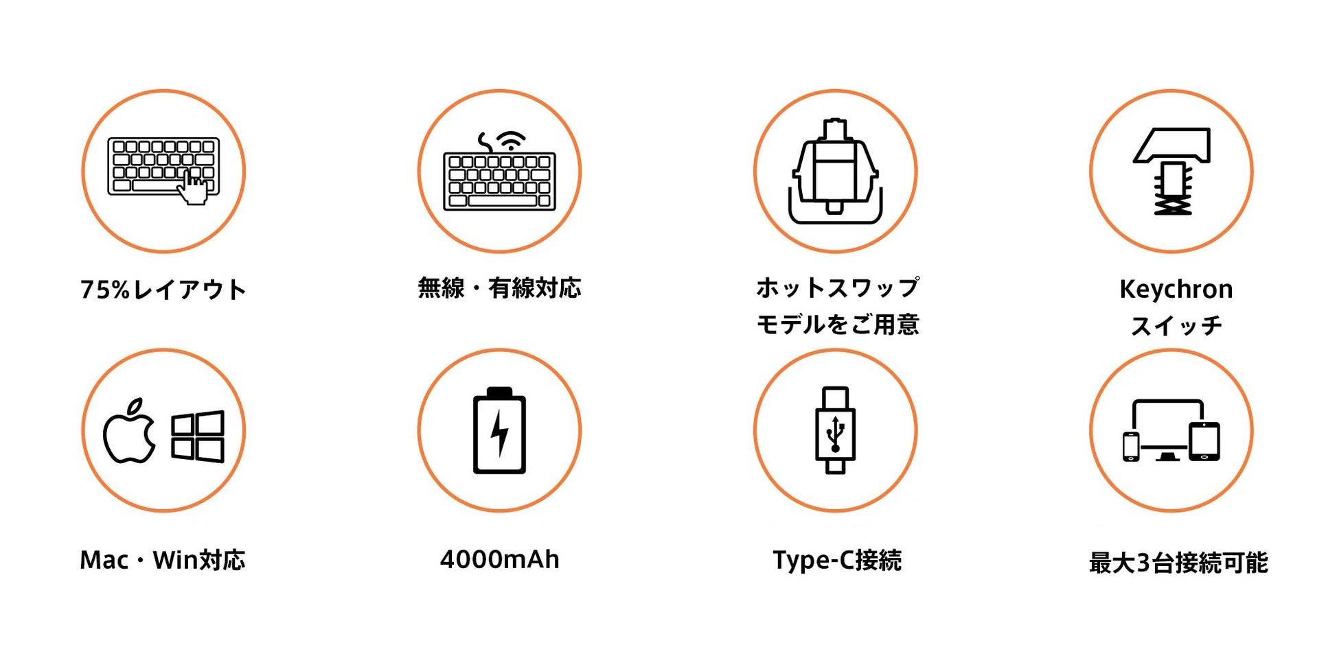 ホットスワップ対応モデルは、ハンダ付けをしなくても、簡単にスイッチを交換することが出来、タイピングエクスペリエンスをカスタマイズが可能です。※ホットスワップタイプのキーボードは、スイッチの変更に対応しています。Keychronノンバックライト(ホットスワップ対応)のソケットは、市販されているMXスタイルの3pin、5pinメカニカルスイッチのほぼ全てに対応しています(Gateron、Cherry、Kailhなど)。なお、誤った方法でのカスタマイズ等は保証の対象外となりますので予めご了承下さい。