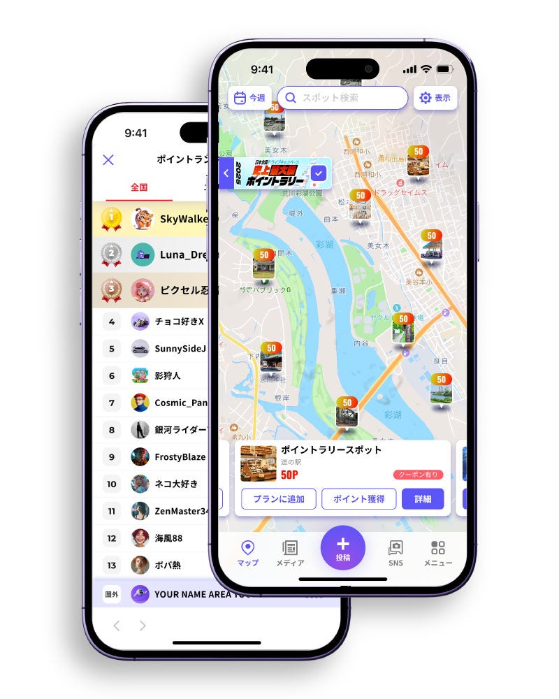 モビリティライフ情報サービスアプリ「MOBILA(モビラ)」をダウンロードし、マップ上に表示されるポイントラリースポットを訪れ、画面をタップすることでポイントが獲得できます。サービスエリアや道の駅などを経由し観光スポットを巡ったり、ポイント数の高いスポットを目指してドライブ計画を立てたり、おでかけの楽しみが広がります。達成状況やポイント獲得数のランキングは、全国、エリア別、スポットカテゴリー別にリアルタイムで確認でき、全国の参加者と競いながらポイントラリーを楽しめます。
