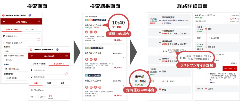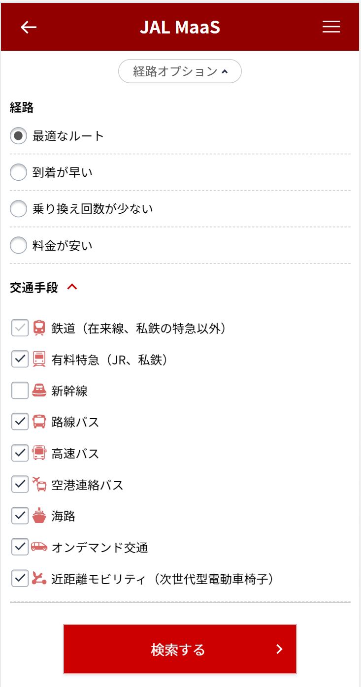 ◇検索対象経路:JALグループ国内線(コードシェア・連結子会社便含む(注1)、WHILL社を含む日本国内における地上交通など