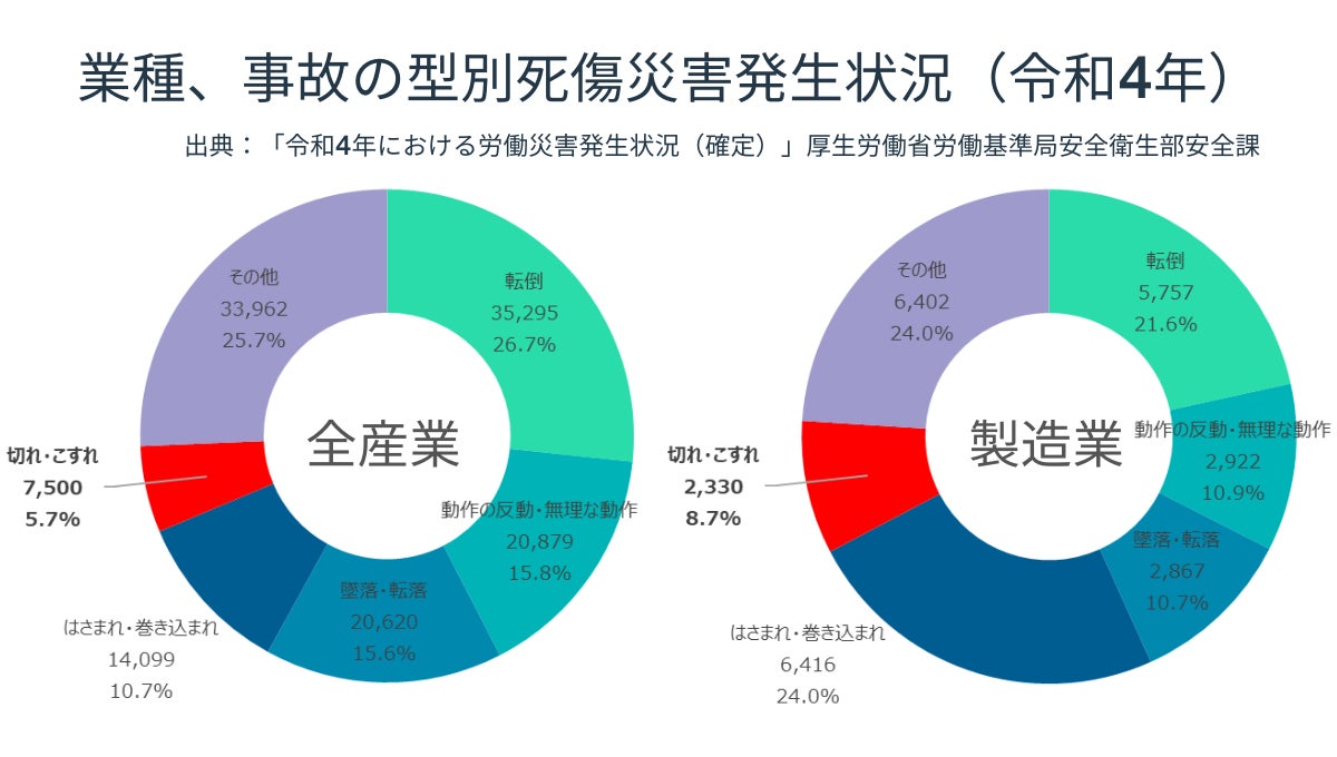「切れ・こすれ」は労災事故全体の約6%を占め、5番目に多い事故型であり、製造業でのその割合は8.7%に及びます。これらの事故を防止するため、当社は労働環境の改善と事故の削減を目指し、作業員の負担を軽減することで安全かつ働きやすい環境の実現を追求しています。