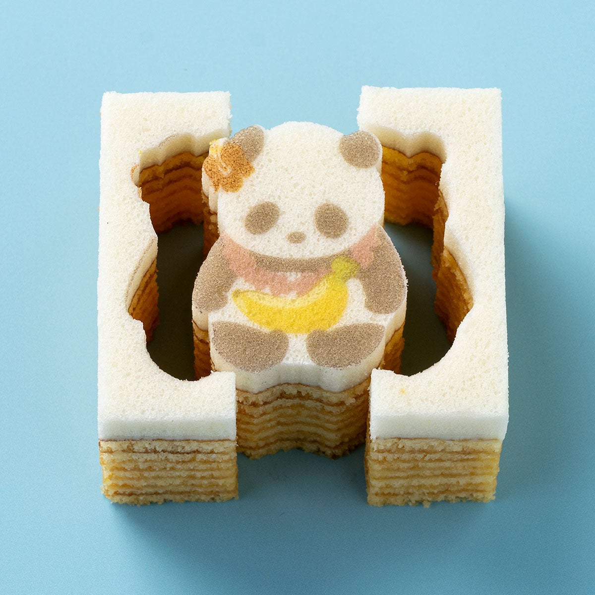 カタヌキヤのバウムは、平焼きバウム。生地を一層ずつ丁寧に焼き重ねて、軽やかなのにしっとりとおいしいバウムをおつくりしています。その一番うえにメレンゲ仕立ての真っ白生地をあわせたら、パンダのかたちにきれいに切りぬいて、夏らしさ満点のパンダたちをプリント。まわりの生地をそっと外すことで、パンダのシルエットに型ぬきが楽しめるようになっています。