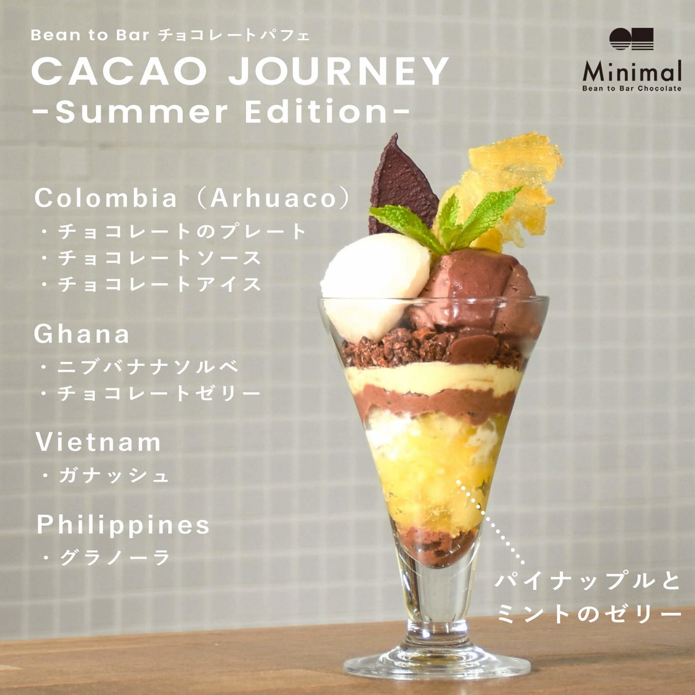 株式会社βace(東京都渋谷区、代表取締役:山下貴嗣)が展開する、日本発のスペシャルティチョコレート専門店 「Minimal - Bean to Bar Chocolate - (ミニマル)」(https://mini-mal.tokyo/)は、カカオとチョコレートをフルーツと共に爽やかに楽しみ尽くす夏季限定のパフェ「CACAO JOURNEY -Summer Edition-」を7月1日より富ヶ谷本店限定でスタートします。