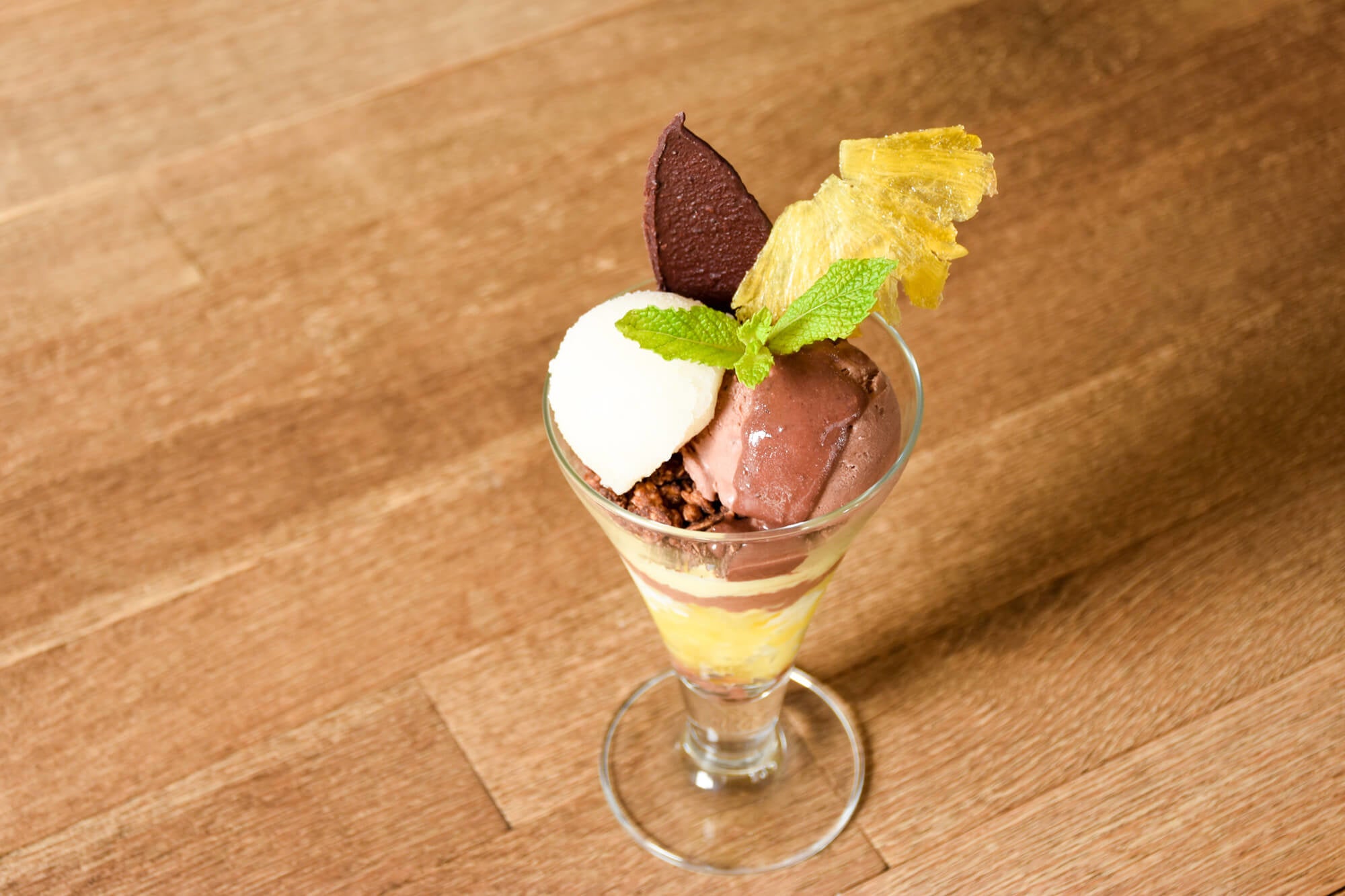 全体を軽い味わいでまとめつつ、グラノーラなど食感がしっかりあるパーツには噛むごとに香りが広がりチョコレートらしさをしっかり感じるフレーバーのチョコレートを使用。パーツに合わせて使うチョコレートを微調整することで、チョコレート感は感じつつ、レモンやパイナップルなどのフルーツも楽しめるチョコレート専門店ならではの夏パフェに仕上げました。