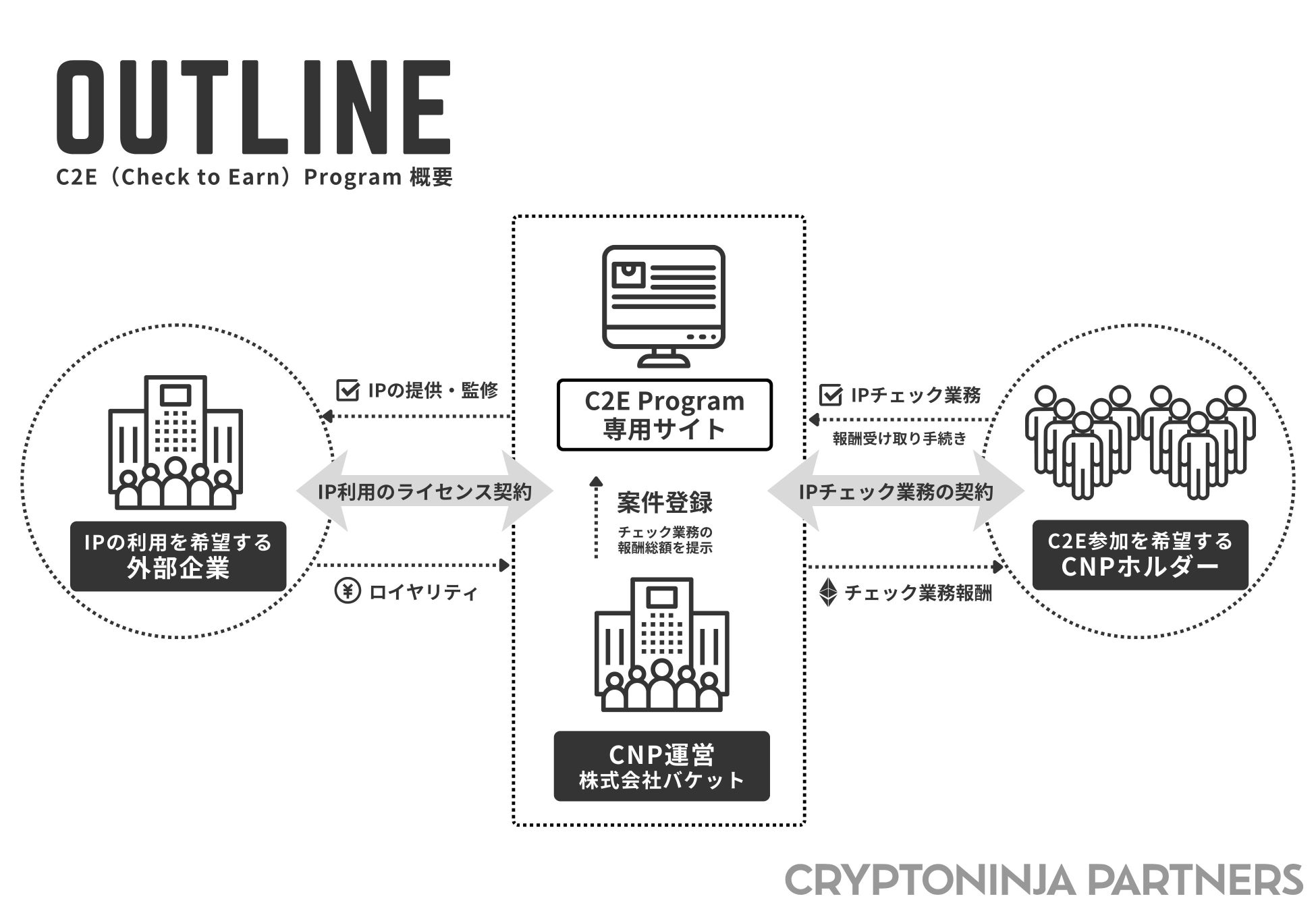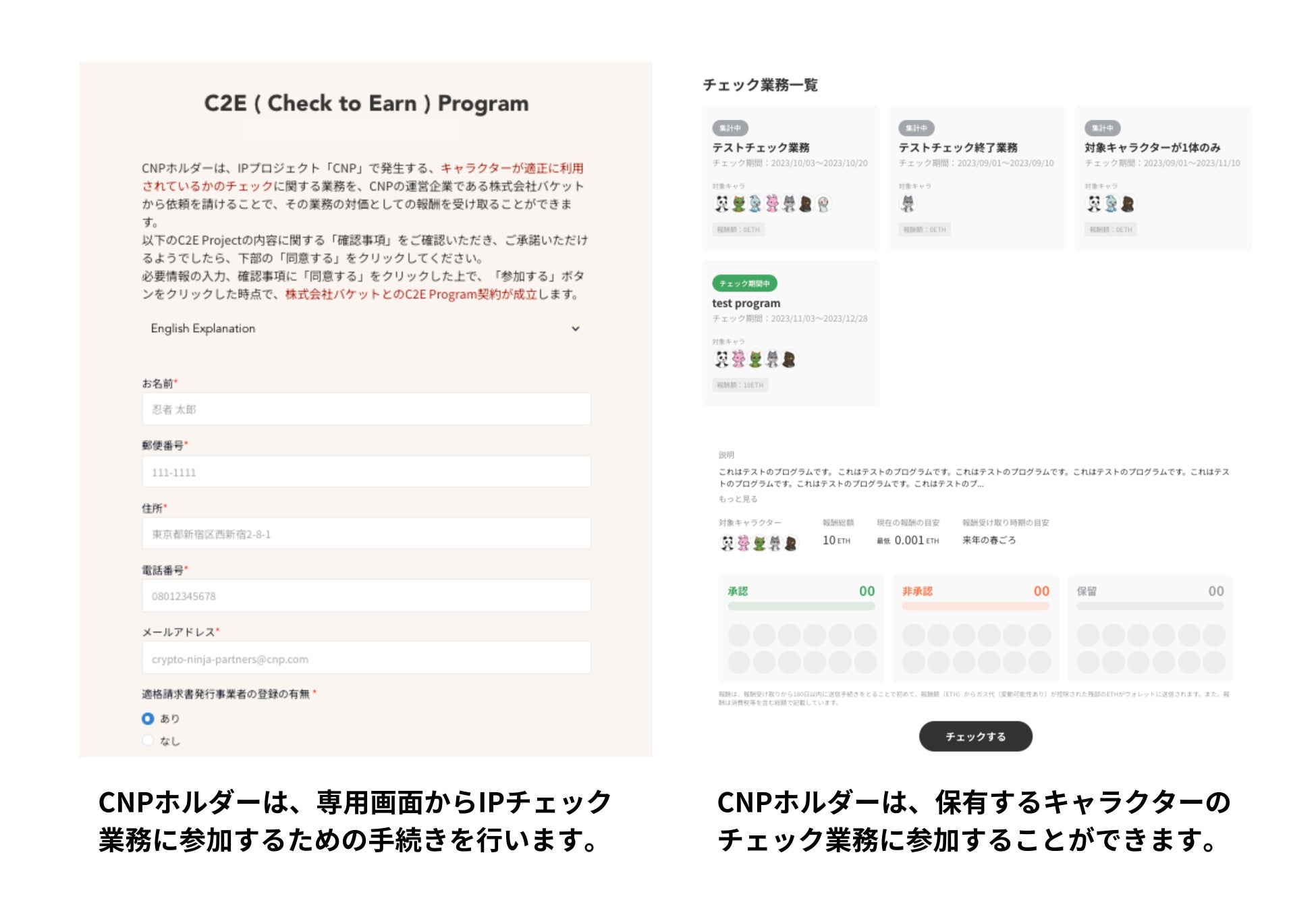 C2E(Check to Earn) Programは、CNPのNFTホルダーに限定してIPのチェック業務を発注。ホルダーの収益機会に加え、IP活動により深く参加できる機会を提供します。