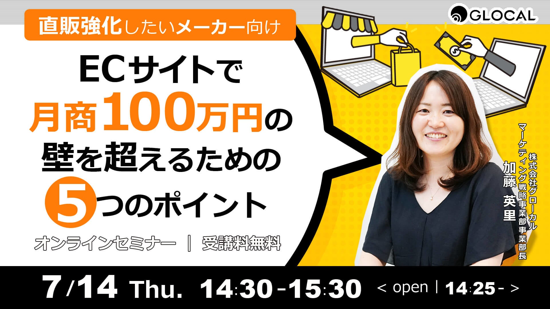 地域の中小・中核企業を対象に経営コンサルティング事業を行う株式会社グローカル(東京都渋谷区、以下グローカル)は、中小規模のメーカー企業の経営者・マーケティング責任者を対象に、ECサイトでの直接販売を伸ばすノウハウについて解説する無料オンラインセミナーを、2022年7月14日(木)14:30から開催します。