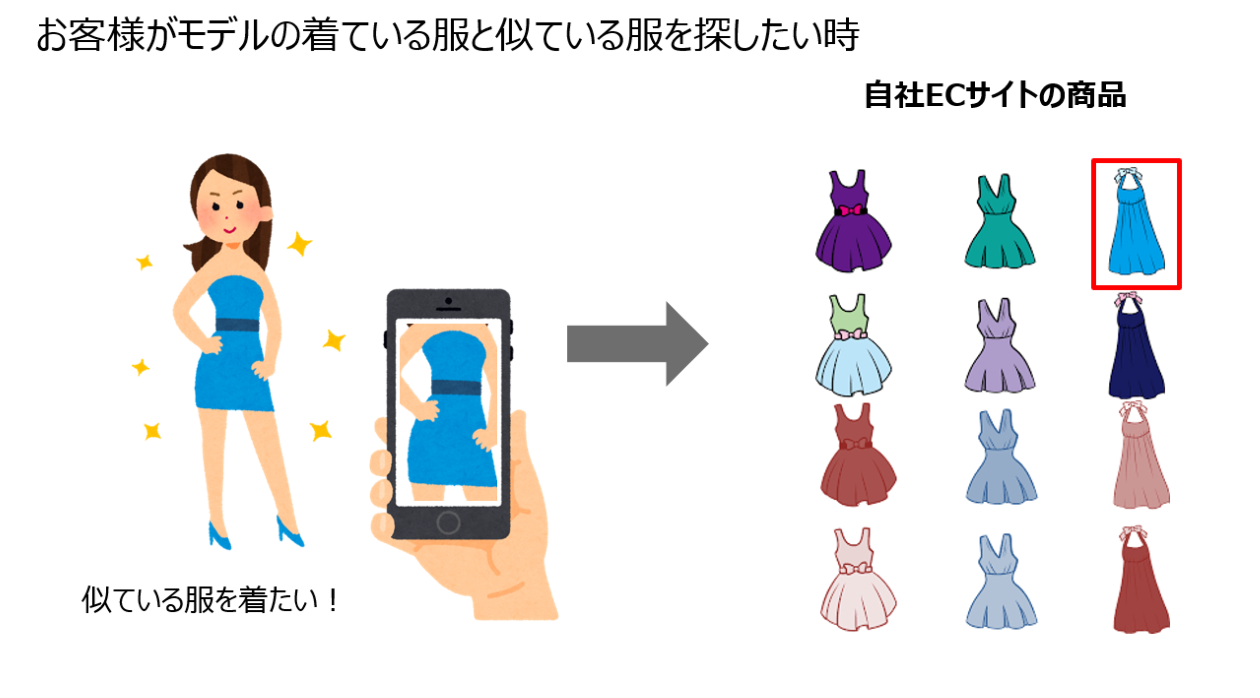 AMY Image Searchを導入することで、ユーザーが探したい商品を画像情報からすぐに見つけられるだけではなく、類似の商品も提示することで、潜在ニーズへの呼びかけが可能です。