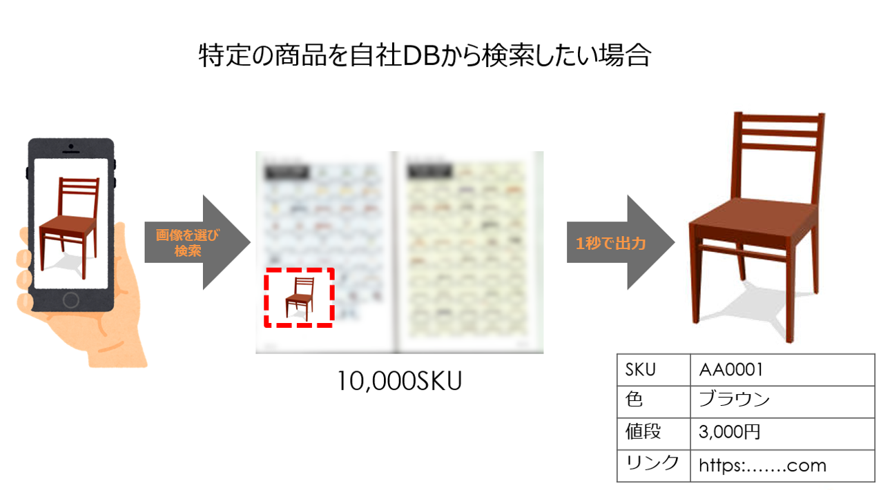 お客様から送られてきた商品画像を自社の商品データベースから検索することで、一致する商品を人が探すよりも何倍も速く検索が可能です。お問い合わせ対応業務の効率化につながります。