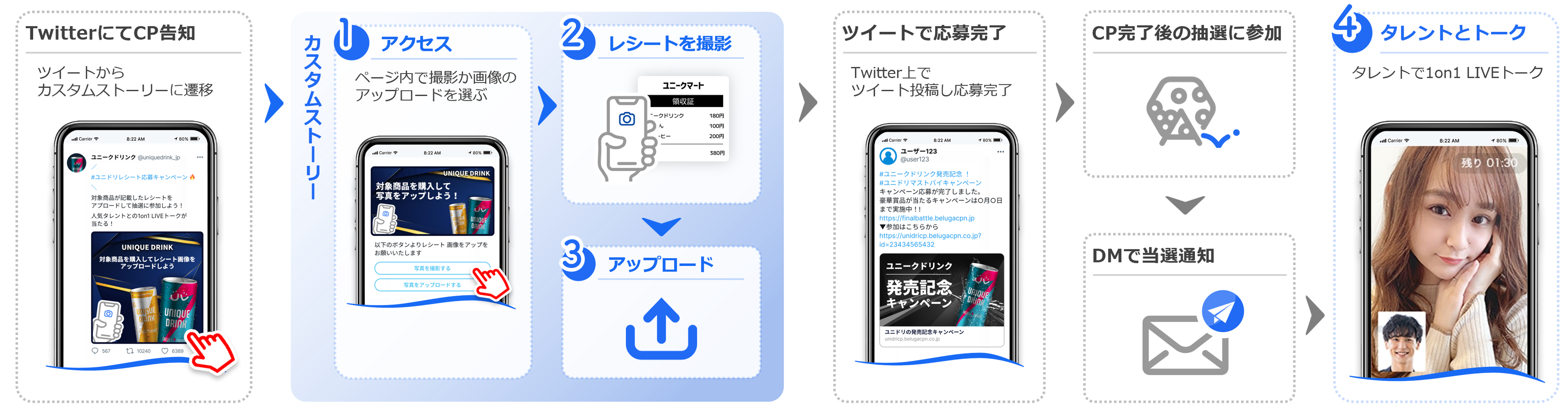 ユニークビジョン株式会社が提供する「カスタムストーリー」と「WithLIVE」の1対1オンライントークを掛け合わせ、Twitterでの拡散や購入促進を目的としたキャンペーンスキームを提供いたします。「カスタムストーリー」はTwitter上でユーザーごとに異なる体験を創出する機能で、「カスタムストーリー」上で診断コンテンツなどを提供することによるユーザーのエンゲージメント向上、ツイート投稿(キャンペーン応募)による拡散という特徴があります。以下フローのようなマストバイキャンペーンにおいては、タレントやアーティストとの1対1のオンライントークが当たるという特典をフックにレシート登録及びツイート投稿を抽選条件とすることで、購買・情報拡散を促進するキャンペーンが実施可能です。