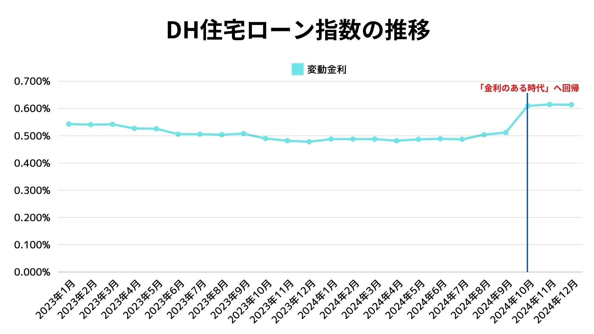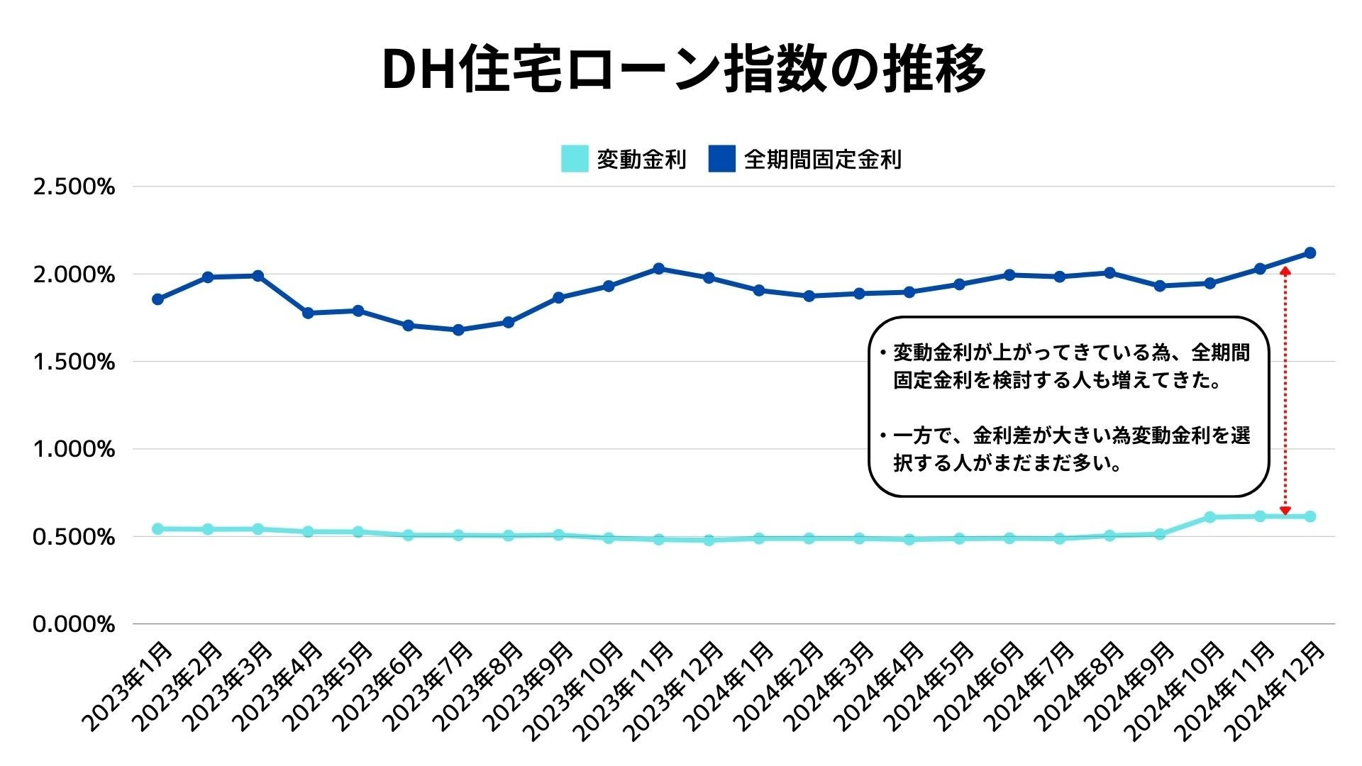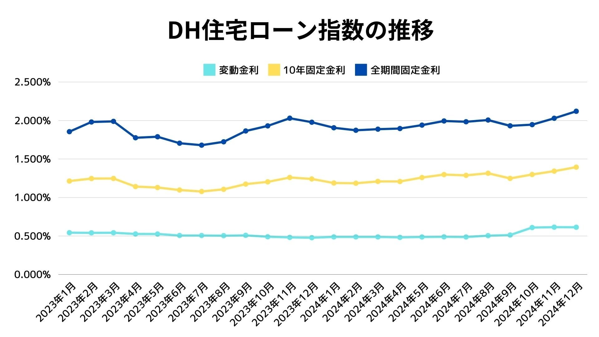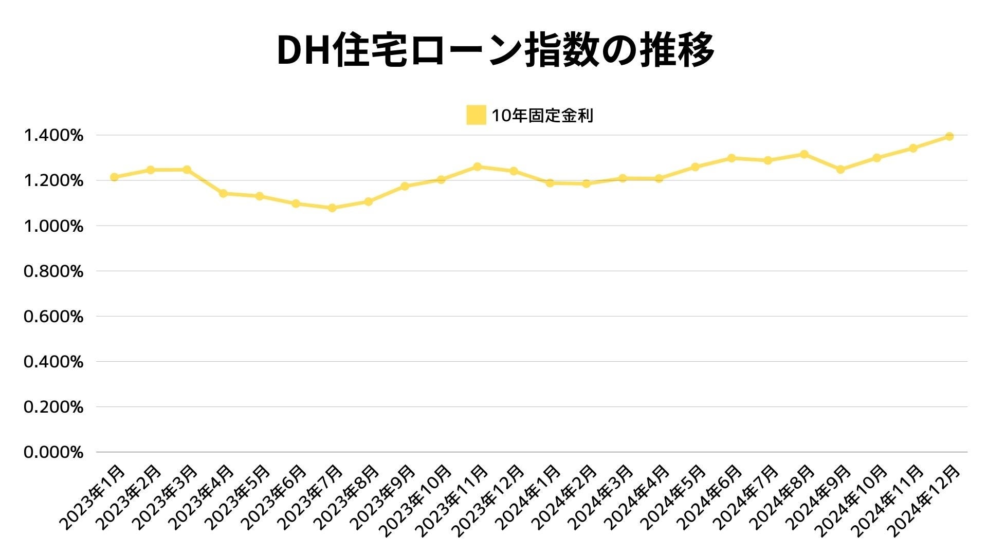 2024年12月初めのDH住宅ローン指数の10年固定は1.394%となり、前月の1.342%よりも上昇しました。